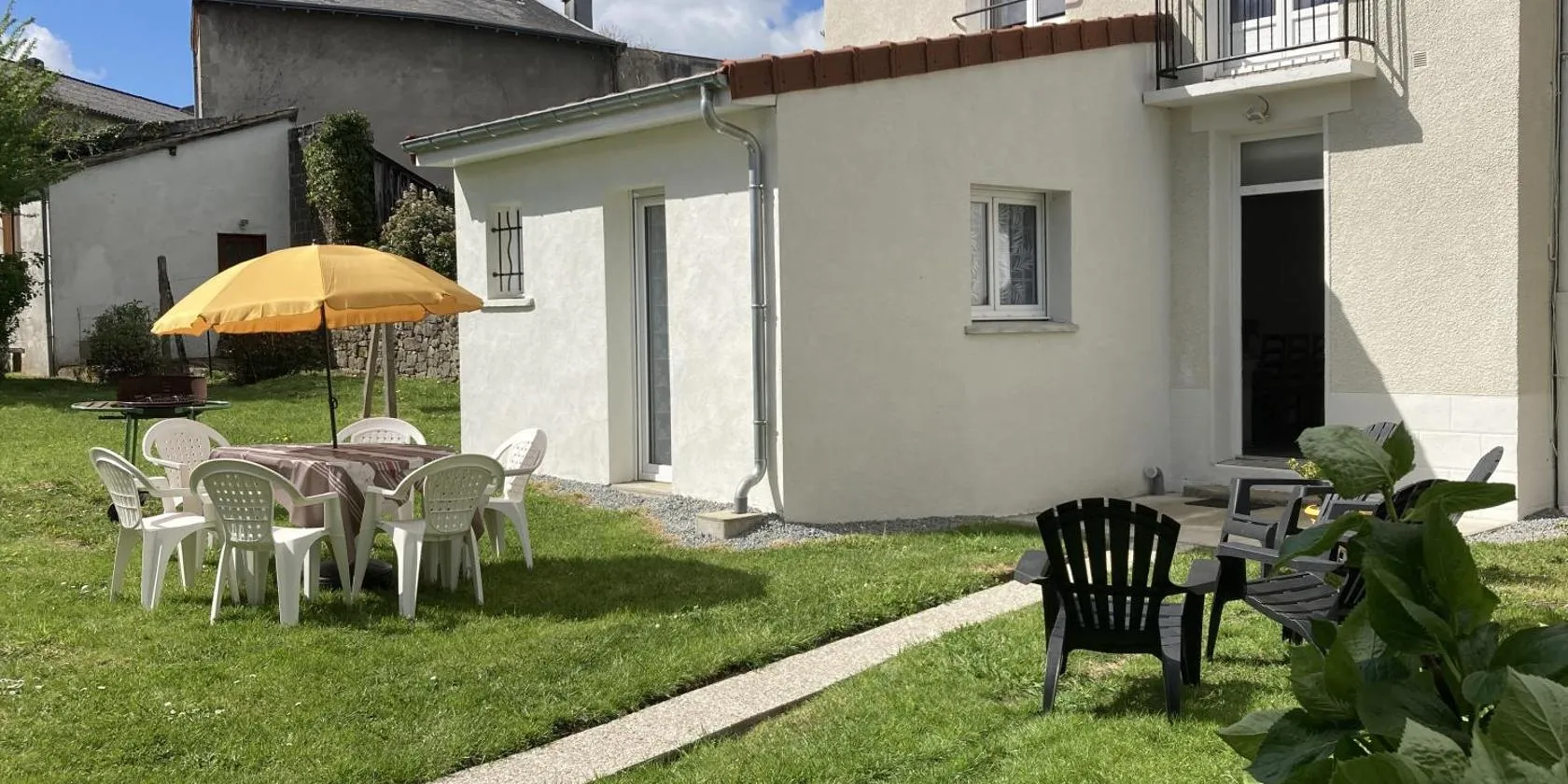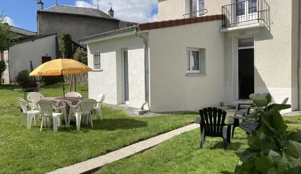 庭の景色を望むPetite maison 2 chambres Guéretはゲレにある宿泊施設で、National Golfから31km、ドリアード・ゴルフから44kmです。この宿泊施設では、バルコニーと無料専用駐車場を提供しています。...