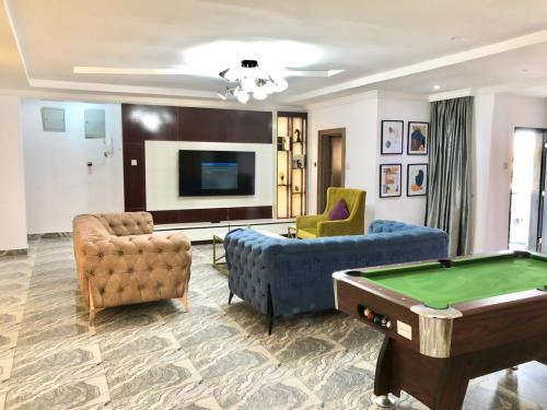 Comfortable Living: Three Bedroom Homely Apartment in Lekki offers a spacious layout with three bedrooms and three bathrooms. The apartment includes a living room, dining area, and balcony, providing ample space for relaxation and entertainment. Modern Amenities: Guests enjoy free WiFi, air-conditioning, and streaming services. The fully equipped kitchen features a refrigerator, microwave, oven, stovetop, and kitchenware. Additional amenities include a washing machine, dishwasher, and tiled floors. Convenient Services: The property provides private check-in and check-out, housekeeping, laundry, and room service. Free on-site private parking is available, along with bicycle parking for active guests. Local Attractions: Located 29 km from Murtala Muhammed International Airport, the apartment is near Nike Art Gallery (2.9 km), Ikoyi Golf Course (8 km), and Lekki Conservation Centre (10 km). Other points of interest include Red Door Gallery and National Museum Lagos.