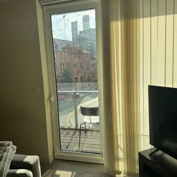 市街の景色を望むCity Centre 2 bed apartment with a balconyはマンチェスター中心部にあり、テラスを提供しています。Chetham's Libraryから徒歩3分の宿泊施設で、館内全域での無料WiFiを提供しています。 バルコニー、ベッドルーム2室、リビングルーム、設備の整ったキッチン(オーブン、電子レンジ付)が備わるアパートメントです。